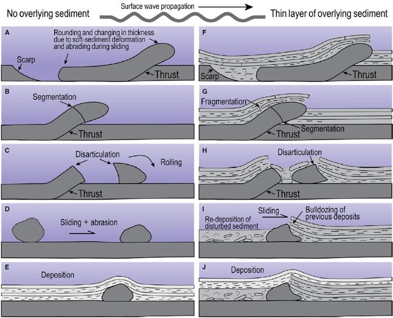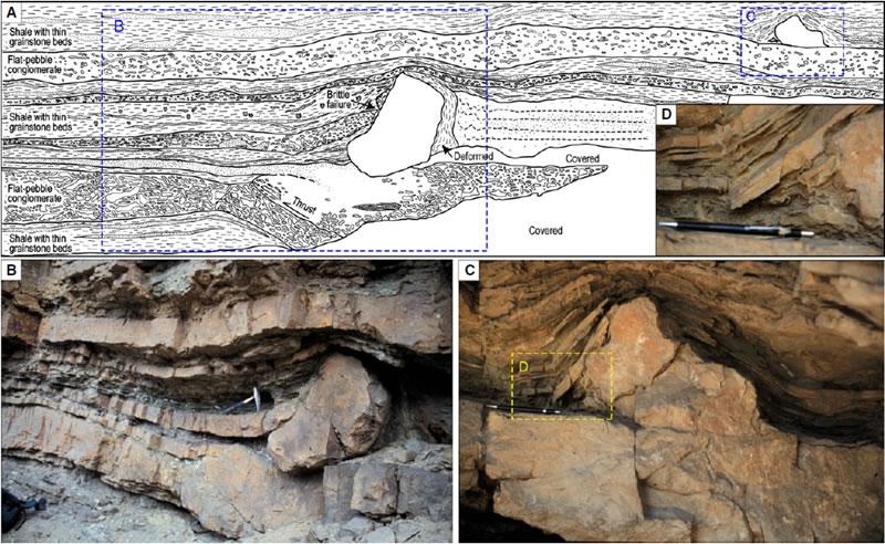 此外,陈吉涛博士还受邀作为论文共同通讯作者合作研究了美国科罗拉多州西部洛矶山脉寒武系发育的独特的软沉积变形构造(图2、3),这些岩块大小为几厘米至一米多不等,通过详细研究发现,这些不规则岩块与小型同生逆冲断层及滑坡壁密切共生,从而提出它们是同生滑塌与逆冲断层的伴生物,认为这些软沉积物变形构造是由地震引发的(图4)。根据这些不规则岩块的形态、尺寸及其共生的逆冲断层倾角等参数,估算了古地震级别为>6.3级,这是目前发现的前第四纪洛矶山脉唯一一次由沉积地层记录的古地震事件。