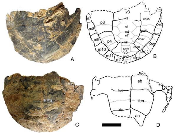海南岛信冲洞中更新世中华花龟化石。A-B,背甲背视;C-D,腹甲腹视。比例尺5厘米。(李录供图)