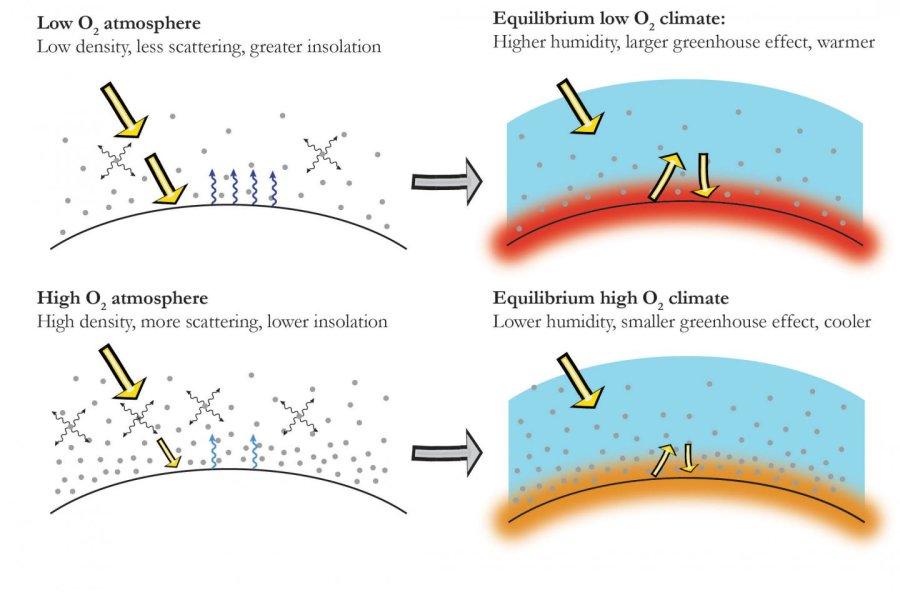 一般来说,氧气的百分比会影响大气的质量与密度,而这转而会影响大气如何吸收和消散入射的太阳辐射。研究人员指出,当氧气浓度偏低时,大气密度会下降,其所致的太阳辐射消散的变化会导致温度和降雨的增加。他们将其模型应用于来自森诺曼时期(大约1亿至9400万年前)的数据;该时期是过去1亿年中最暖和的时期之一,它也是大气中氧浓度很低的时候。通过纳入氧气对气候影响的考量,研究人员的模型能比仅用二氧化碳数据的模型更协调地预测森诺曼时期的气温。