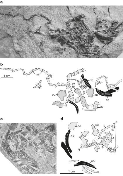 研究人员在最新一期《自然》杂志上报告说,与半甲齿龟相比,德国发现的这种史前龟腹部肋骨还没有形成一个完整的甲壳,颌骨上有牙齿,颅骨在太阳穴处有两个大的开口。他们将这种龟描述为“祖龟”。