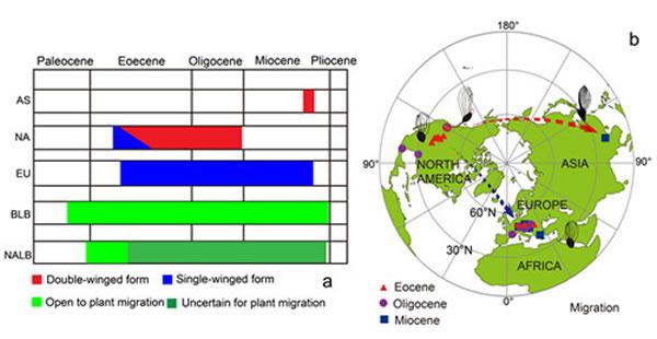 近期,中国科学院昆明植物研究所古气候变迁与物种演变研究组博士研究生贾林波在周浙昆研究员的指导下,与研究组成员一起在云南省马关县城郊发现了大量保存精美的椿榆属果实化石,标本产自晚中新统地层(时代为5.3-11.6百万年前)。这是该属化石在亚洲的首次发现。根据化石的形态大小、翅脉数目、主翅形态等特征,作者描述了椿榆属一新种,亚洲椿榆(Cedrelospermum asiaticum)。通过总结椿榆属的化石历史,比较椿榆属在亚洲、北美和欧洲的果实形态并结合地质背景,作者提出假说:椿榆属起源于北美不晚于早始新世,果实具单翅;随后经由北大西洋路桥(North Atlantic land bridge)传播到了欧洲。随着北大西洋路桥在早始新世以后逐渐瓦解,椿榆属在北美和欧洲之间形成了隔离。早始新世以后,果实具双翅的椿榆属类群在北美演化并经由白令陆桥(Bering land bridge)传播到了亚洲。此外,化石记录表明,该属在始新世-渐新世界线(Eocene-Oligocene Transition)全球变冷时期,经历了大幅度的向南退却;并最终在渐新世以后在北美消失,在中新世以后在亚洲和欧洲消失。椿榆属在亚洲的灭绝可能与晚中新世以后东亚季风气候的不断增强有关。本研究为榆科的演化和生物地理,以及板块运动(路桥的存在和瓦解)和气候变化对植物迁移和分布的影响,提供了新资料。