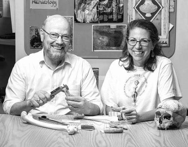 考古学家David Anthony(左)和Dorcas Brown测量了一副来自欧洲大草原的骨架。(DREW GURIAN)