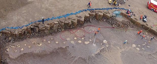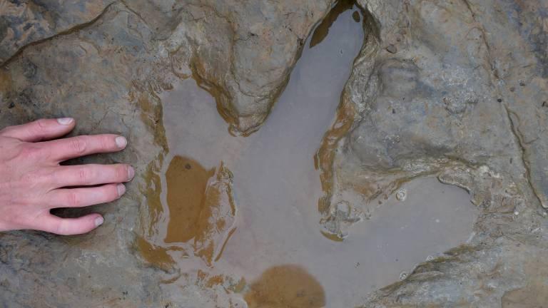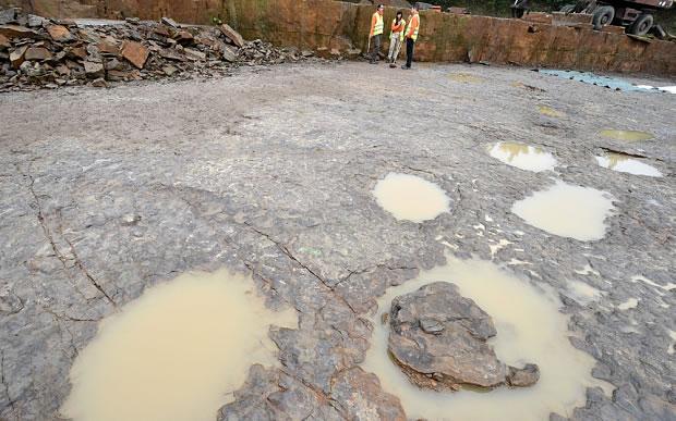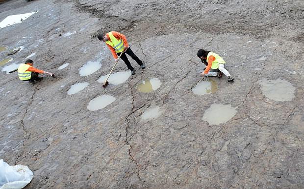(化石网报道)德国Muenchehagen,考古学家在当地一个砂石厂发现了90枚恐龙足迹,这些足迹大多是异特龙和长颈恐龙的脚印。