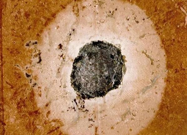 这块嵌在石灰岩中的、已经化石化的陨石在欣讷山十分典型。正中间的一团黑色物质便是陨石本身,陨石周围的灰色区域则是被氧化成红色的石灰石在受到陨石撞击时发生了还原反应的证据。