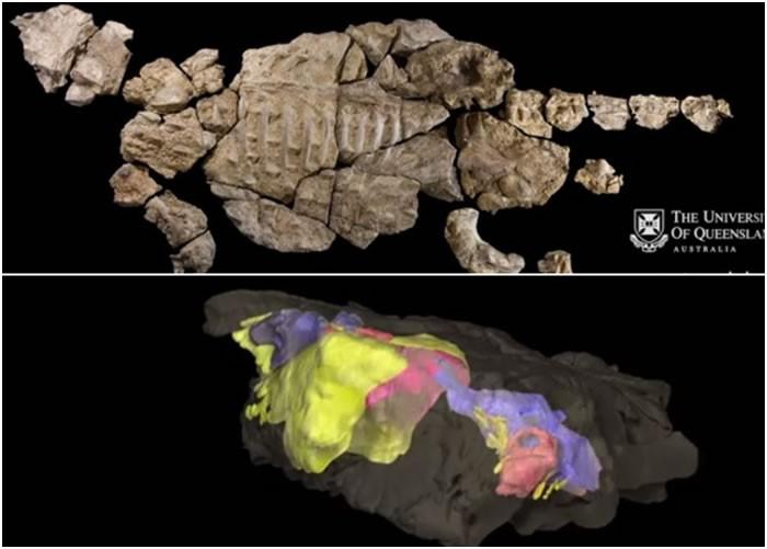 科学家对Kunbarrasaurus的骸骨(上图)进行3D重组工程(下图)。
