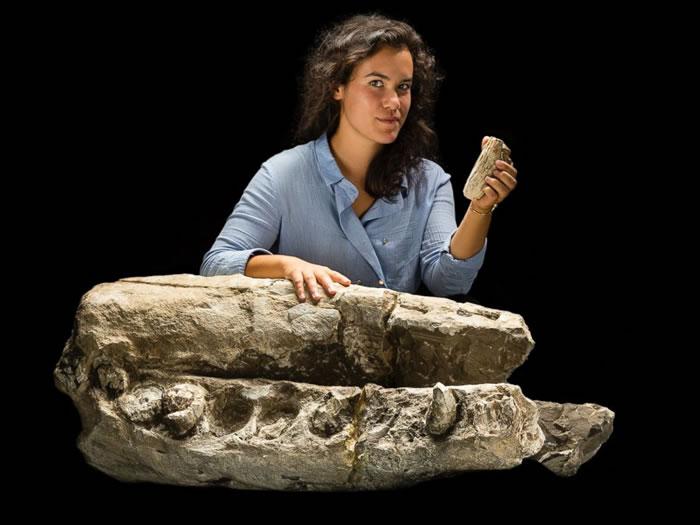 研究学者Alex Boersma站在Albicetus mxymycterus化石标本旁边,手持一颗牙齿。据悉,此化石可追溯到1,400-1,600万年前。