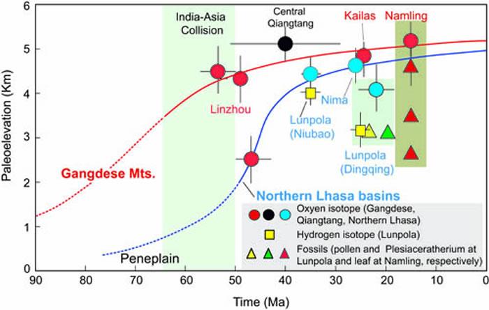 另一方面,大多数依据碳酸盐氧同位素进行的古高度重建认为在古近纪末期到新近纪初期青藏高原已达到现在的高度。然而,同位素古高度方法需要假设一系列不确定参数和条件,如地质年龄、成岩作用、样品类型、蒸发效应、大气温度、气候变化等,由此可能导致古高度的错误解释。例如,从氧同位素的角度看,现代的青藏高原可以分为两个地区:南部地区的氧同位素垂直梯度变化率急剧,而北部地区的变化率只达到南部的一半水平。但是,针对各个新生代盆地的古近纪时期或新近纪时期,应该采用什么水平的氧同位素垂直梯度变化率,不同的研究者却持有不同的观点。