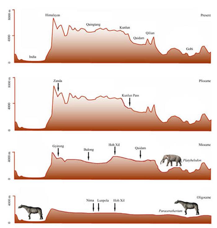 如果将青藏高原作为一个整体来看,古生物的证据能够重建出新生代以来的连续隆起过程。在渐新世时期,巨犀生活在青藏高原北侧的中国西北地区,与此同时在青藏高原南侧的印巴次大陆也有巨犀分布,由此指明在那时的地势还不是太高,还不足以阻碍大型动物的交流,巨犀、巨獠犀和爪兽等仍然能够在“青藏高原”南北之间穿行。至中新世中期,在青藏高原北侧的许多地点发现了铲齿象化石,但在青藏高原南侧的西瓦立克地区却没有这类动物的任何踪迹,显示青藏高原已经隆升到相当高的程度,成为当时哺乳动物交流的屏障。