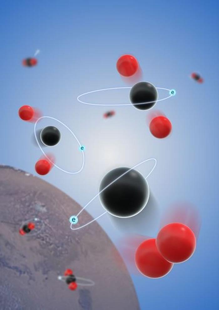 在早期大气环境中存在较多的二氧化碳和低能量电子,田善喜研究组提出这些二氧化碳分子可以捕获低能电子,而后可能发生两种解离反应,即产生碳原子负离子和自由氧原子或者氧分子。他们利用自主研制的负离子速度时间切片成像谱仪,检测到了上述两个反应通道,并进一步阐述了各通道所占比例随电子贴附能量变化的原因,以及作为产物的自由氧原子和氧分子在早期大气化学反应中的作用。