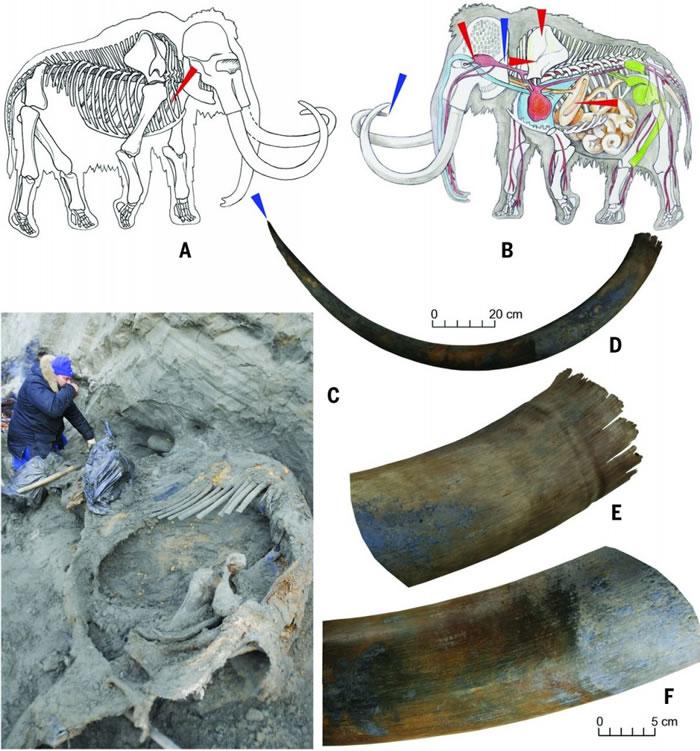 俄罗斯科学院的弗拉基米尔-皮图尔科(Vladimir Pitulko)博士称,猛犸骨骼和长牙出现的一些凹痕很可能是锋利武器造成的,例如:长矛,此外,长牙上的伤痕表明人类曾试图截断长牙。