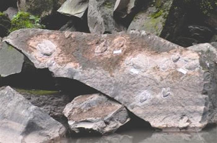(化石网报道)据成都商报(蒲康林):足迹呈圆形,两个脚趾和牛、羊等偶蹄类动物足迹有些相似,这些奇怪的足迹于2015年秋天在泸州市古蔺县桂花乡桂花河畔的石头上被发现。中国地质大学与美国科罗拉多大学的恐龙足迹联合研究团队认真研究后发现,这是远古时代恐爪龙的足迹。因该足迹大于中国山东的发现,小于美国犹他州的足迹,该足迹为亚洲已发现最大的恐爪龙足迹。