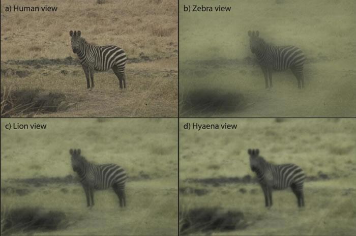 对6.4米远处一直静立的平原斑马拍照,处理过后的照片呈现出了其在不同生物眼中的情况,分别是:人类视角、斑马视角、狮子视角和鬣狗视角。