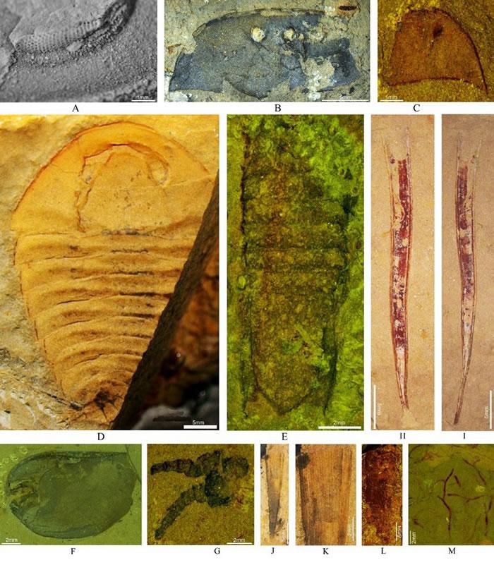 寒武纪晚期果乐生物群的主要组成分子(A为三叶虫的眼睛,B-G为节肢动物,J-L为软舌螺,M为藻类)