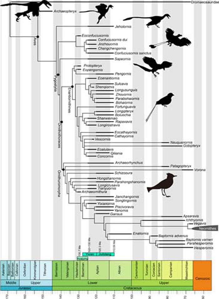 图1. 中生代鸟类谱系树以及主要支系的起源和分异时间(王敏供图)