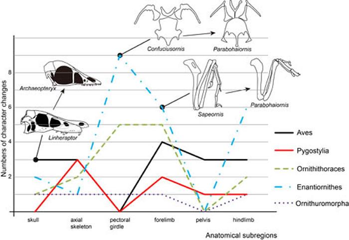 通过比较不同解剖学分区(头部、肩带、前肢、腰带、后肢)的演化速率,王敏等发现,肩带和前肢部分的形态特征变化,明显快于其它部位(图3),表明鸟类的早期演化主要受飞行的选择压力影响。
