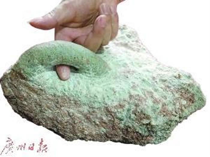 据河源恐龙博物馆馆长杜衍礼介绍,今年4月上旬,在河源市区迎客大桥西边恐龙蛋化石埋藏地施工的一民工向该馆报告,称在一块红砂岩地块的表面发现一件隆起的东西不知为何物,请求该馆工作人员前往辨别和鉴定。
