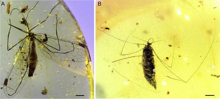 科学家们在缅甸北部胡康河谷的森林中发现了几个包裹在琥珀中的现代草蛉的前身,这种飞虫又长又细,翅膀上布满静脉和游丝。这些宝贝可以追溯到大约1亿年前的白垩纪中期,其中包括幼年草蛉和成年草蛉,但幼虫尤为引人注目。食蛛长足蛉的幼虫 (Pedanoptera arachnophila,右上),其体形大致像蛆,但拥有令人难以置信的又长又瘦的腿,而且,作者写道:“其腿部结构如此精细以至于几乎不可想象它们可以支撑比自己大这么多的身体”。