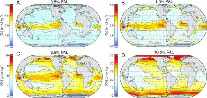 Christopher Reinhard及其同事把定量生物地球化学模型与大气氧水平的地球化学约束条件结合起来,从而确定了在大约18亿年到6亿年前的元古宙中期到晚期的海洋氧水平的空间与时间分布。根据这些模型,海底在很大程度上是缺氧的,即便当大气氧水平远高于假定的生命所需的水平。表面海洋溶解氧水平表现出了相当大的空间变化性,而且也有季节涨落,导致了在几乎最高的大气氧水平的情况下的一年的那部分时间里的氧水平降到了基础动物的估计耐受范围以下。