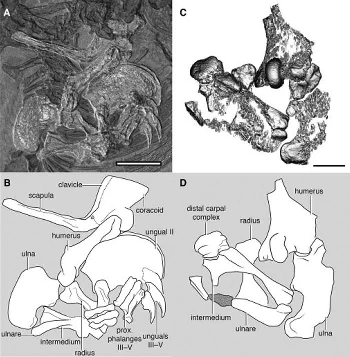 另外,尽管镰龙前肢十分奇特,但研究人员表示可能已经找到其进化的线索。该物种的近亲巨爪蜥就具有不对称的尺骨和略细长的腕骨。换句话说,镰龙前肢的变化是为爪子的变化做准备的。