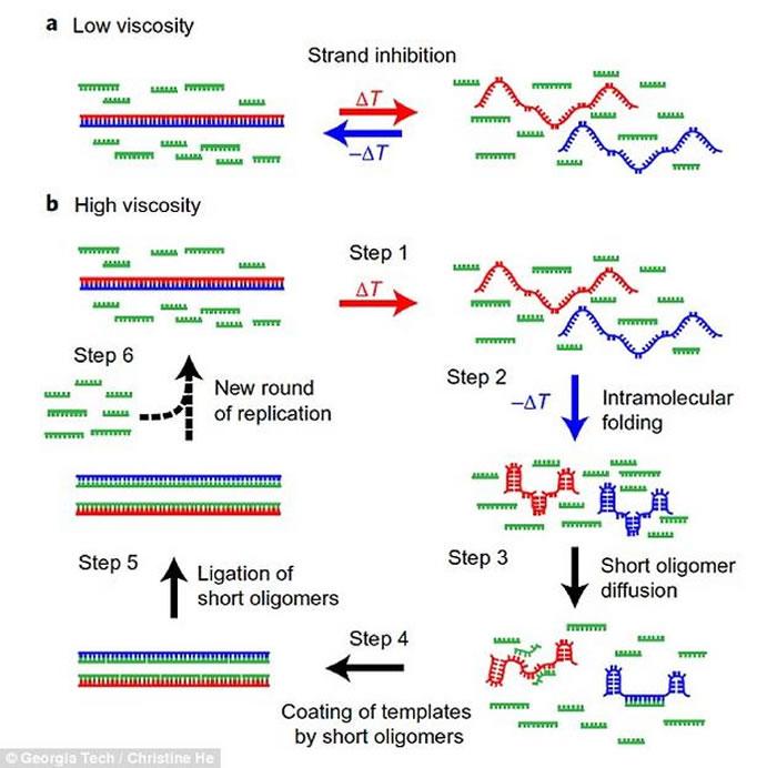 美国乔治亚理工学院科学家克里斯汀-何和艾塞克-加莱戈等人希望能够解开一个谜团,即在酶出现之前,现代基因编码的早期形式是如何实现首次复制的。研究人员并没有将实验环境选择在水中。他们向包含有真正基因链的“汤”中加入一种粘性溶剂--增稠剂,从而减慢长链的运动速度。克里斯汀-何解释说,“这样看起来更像是生命起源的化学成份,因为在生命起源之前,地球上可能有许多粘稠的水塘。在这样的溶液中,运动较快的短链就有机会跳到长链上,并组合形成长链的复制品。”
