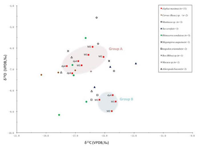 据文章通讯作者胡耀武教授介绍,本项研究选取了晚更新世早期(距今十万年左右)广西崇左左州岜仙洞遗址中出土的32枚大哺乳动物牙齿化石作为研究对象,通过牙釉质的C、O稳定同位素分析,揭示亚洲象的摄食模式,并通过与之前发表的同位素数据比较,尝试探讨亚洲象属摄食模式的演化轨迹。