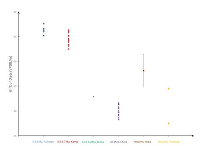 进化过程中亚洲象碳同位素数据汇总图(马姣和王元提供)