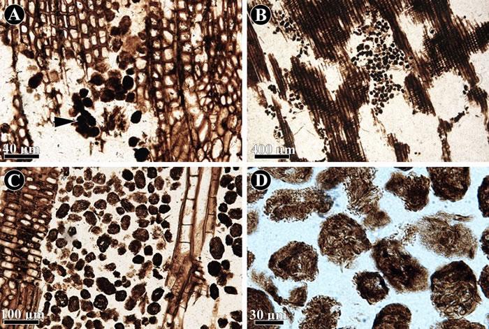 化石木材的降解过程(由胞间层开始A, D,逐渐向次生壁降解B,C)