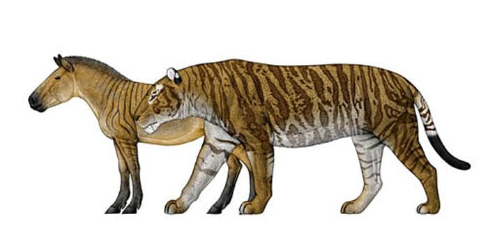 恐剑齿虎与其主要猎物平齿三趾马的体型对比(陈瑜绘)