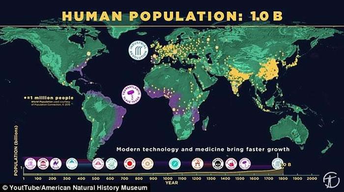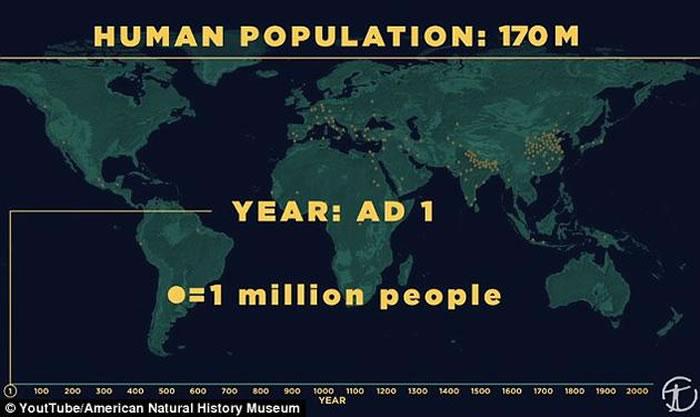 视频中指出,从20万年前现代人类刚刚在非洲大陆上出现、到10万年前人类开始向全球迁移的这段时间里,人口数量很可能一直保持在100万以下。 随后随着农业的发展,人口增长开始加速。到了公元1世纪,地球上的人口数量约为1.7亿。