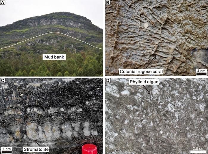 华南石炭纪生物礁主要类型(A)碳酸盐岩泥丘;(B)珊瑚礁;(C)微生物礁(叠层石礁丘);(D)藻礁(叶状藻礁)