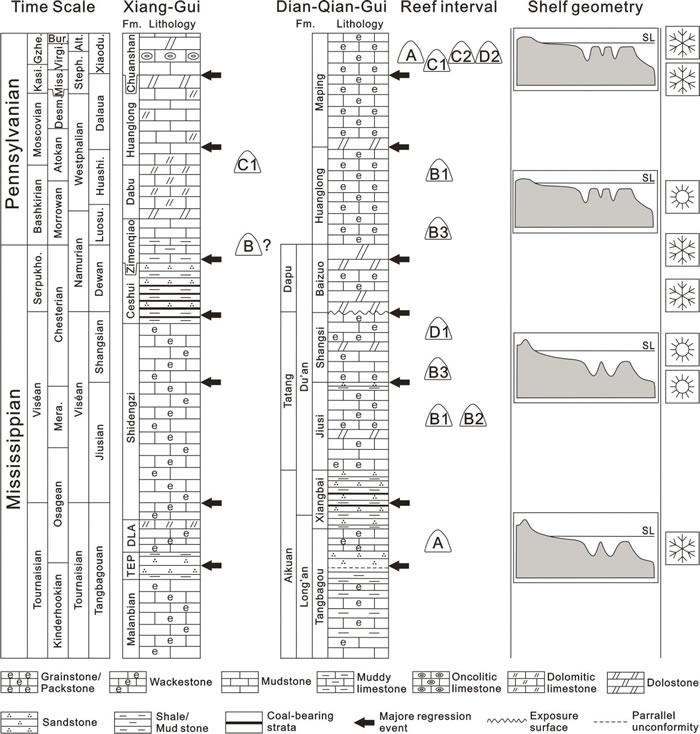 华南石炭纪主要岩性柱,生物礁分布及其与古地理、古环境变化关系