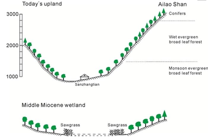 哀牢山南麓中中新世湿地景观与现代山地景观的对比
