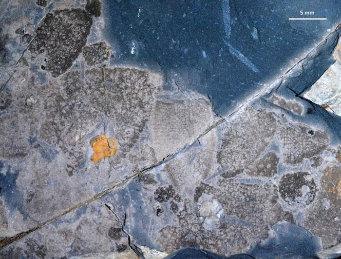 聚集式埋藏的海绵体(至少包括7个海绵种)。右上方黑色页岩中的2个化石为笔石