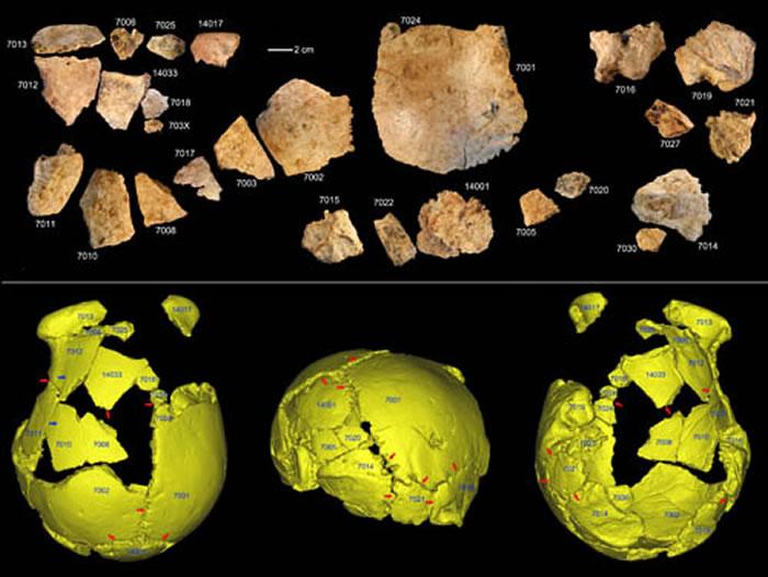 许昌2号头骨化石碎片及头骨化石的3D虚拟复原(吴秀杰供图)