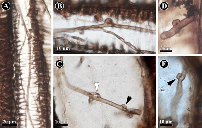 保存在科达茎干(Shanxioxylon sp.)初生木质部中的担子菌类菌丝。(黑色箭头指示锁状联合结构)