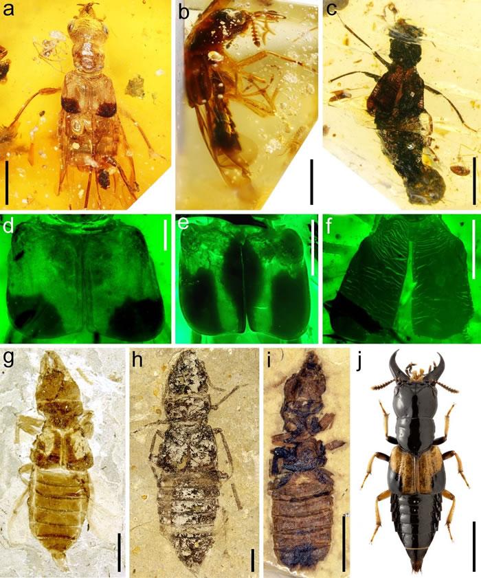 巨须隐翅虫的多样性。a-c,白垩纪中期缅甸琥珀中不同的巨须隐翅虫;d-f,不同的巨须隐翅虫鞘翅上具有不同的花斑;g-h,早白垩世热河生物群中的巨须隐翅虫;j为现代的巨须隐翅虫。