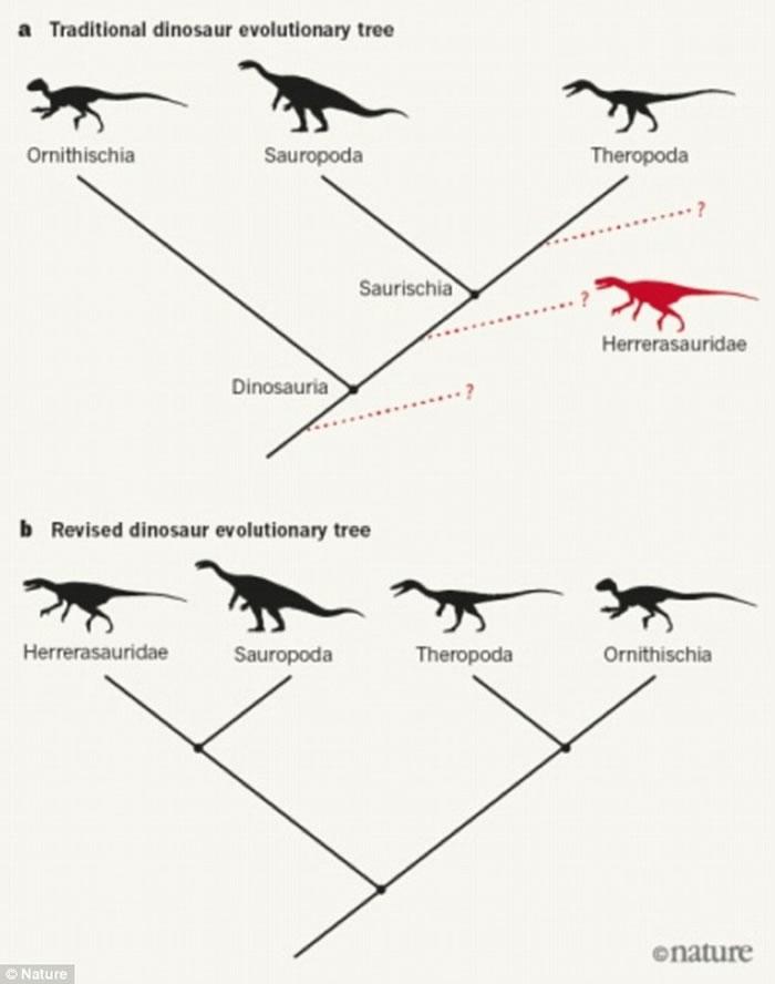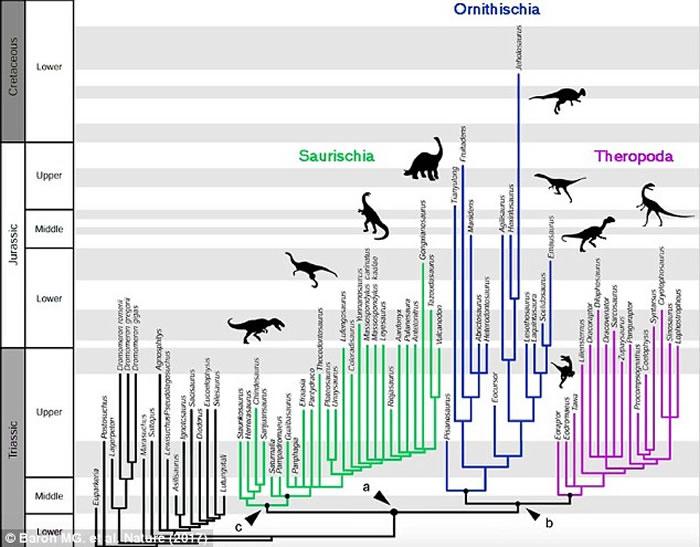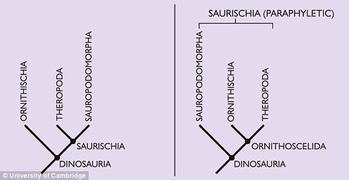来自剑桥大学及伦敦自然历史博物馆的研究人员对恐龙演化关系史进行了重新梳理,分析了大量早期恐龙在解剖学上的相似性和差异,提出的新假说对恐龙分类进行了调整。他们认为鸟臀目和兽脚亚目恐龙应该被归在一个新分支中,因为这两种恐龙其实有多项特征是源自同一个祖先。此外,新假说将蜥脚亚目恐龙与一种被称为艾雷拉龙的早期肉食性恐龙分在一起,研究人员认为这些肉食性恐龙中的类似特征可能是各自独立演化出来的。