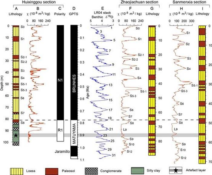 中国科学院地球环境研究所敖红研究员联合国内外同行,对三门峡阿舍利的年代进行了详细研究。研究剖面厚103米,由上部的黄土序列和下部的河流相地层组成,遗址层位在剖面的92~95米。磁化率和岩性结果表明上部的黄土序列包括了S0–S8,地层连续完整,没有缺失(图2)。古地磁结果表明该剖面记录了布容正极性时和松山负极性时上部的沉积,布容-松山极性界限位于L8底部,阿舍利文化层位于布容-松山极性界限以下~8米的灰绿色粉砂质粘土中,年代约0.9 Ma,对应深海氧同位素23阶段。因此,三门峡遗址出土的阿舍利石器比百色盆地的阿舍利石器早了约10万年,成为东亚中纬度地区早更新世晚期的阿舍利文化代表。这一研究对于理解中国北方旧石器文化面貌的复杂多样,探讨欧亚大陆早期人类迁徙和阿舍利技术的传播过程提供了重要参照。