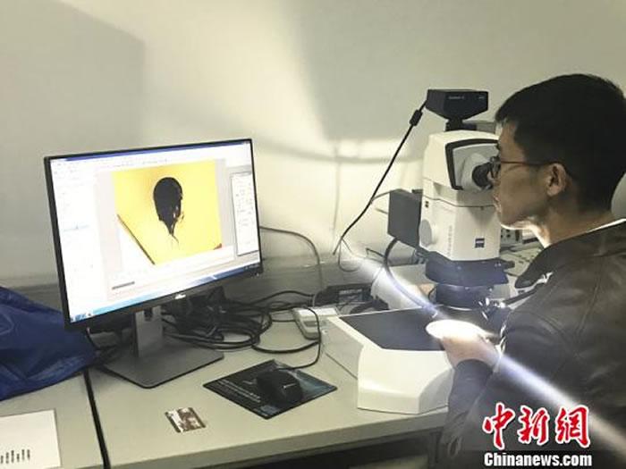 蔡晨阳博士通过显微镜观察白垩纪琥珀内的“白蚁城堡”