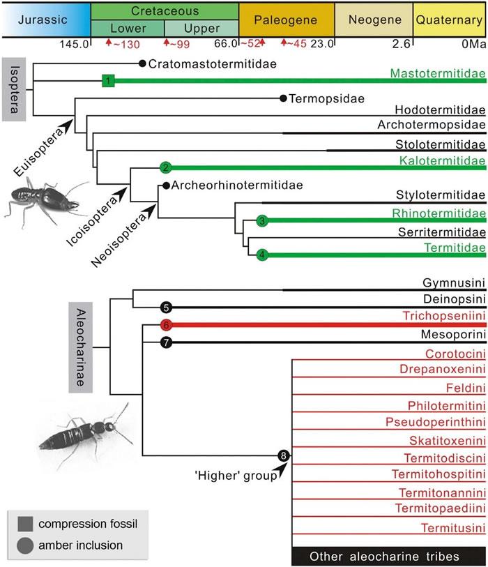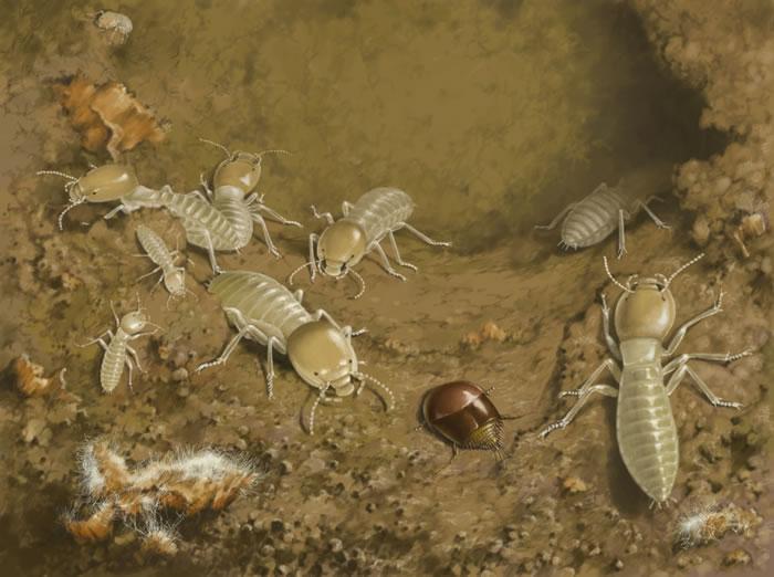 (化石网报道)据中国科学院南京地质古生物研究所:自然界中社会性昆虫(如蚂蚁、白蚁和蜜蜂)与其他动物之间存在十分密切的关系.昆虫之间互相利用,从而使得一方或双方得以更好地利用资源、获得保护、适应环境和占领新的生境。白蚁是目前已知最为古老的社会性昆虫,其社会性起源于侏罗纪晚期,显著早于其他社会性昆虫。白蚁巢穴中也常寄居有种类多样、形态特化的小型动物(主要为昆虫),有些离开蚁巢则无法生存,它们被称之为螱((wèi))客(Termitophiles),这种现象可称为社会性寄生。通过长期而复杂的演化适应,螱客能够侵入隐蔽的白蚁巢穴,利用巢穴内适宜稳定的环境、丰富营养的食物,并能获得蚁穴这一天然屏障的有效保护。螱客生活在较为封闭的白蚁巢穴中,化石记录极其稀少。