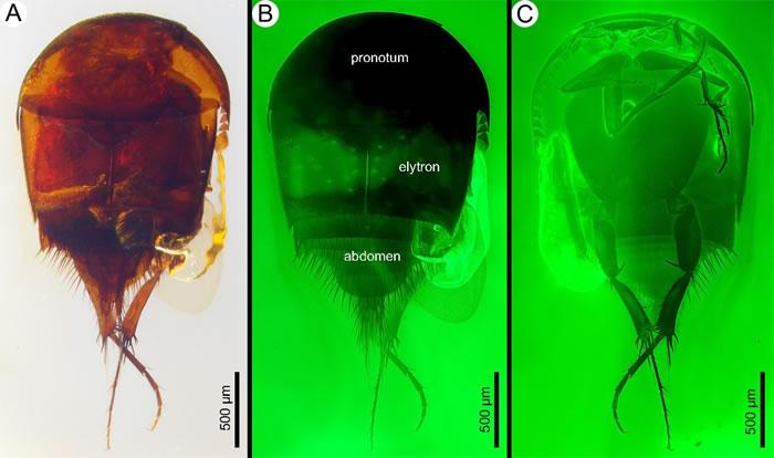 研究人员在白垩纪中期缅甸琥珀中(约1亿年前)发现的两枚保存完好的隐翅虫化石,其形态非常特化,头部、触角、前足和中足全部缩于身体腹面,呈典型的似鲎体型。通过激光共聚焦显微镜、荧光显微镜和生物显微镜的成像观察,发现这类甲虫后足基节与后胸腹板完全融和在一起,代表了现生前角隐翅虫亚科Trichopseniini族(毛螱隐翅虫族)的重要鉴定特征,与现生的Prorhinopsenius属(原鼻螱隐翅虫属)较为接近。基于其极其特殊的体型和后足特征,建立了一新属一新种,即缅珀白垩毛螱隐翅虫(Cretotrichopsenius burmiticus Cai et al., 2017)。