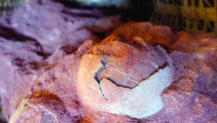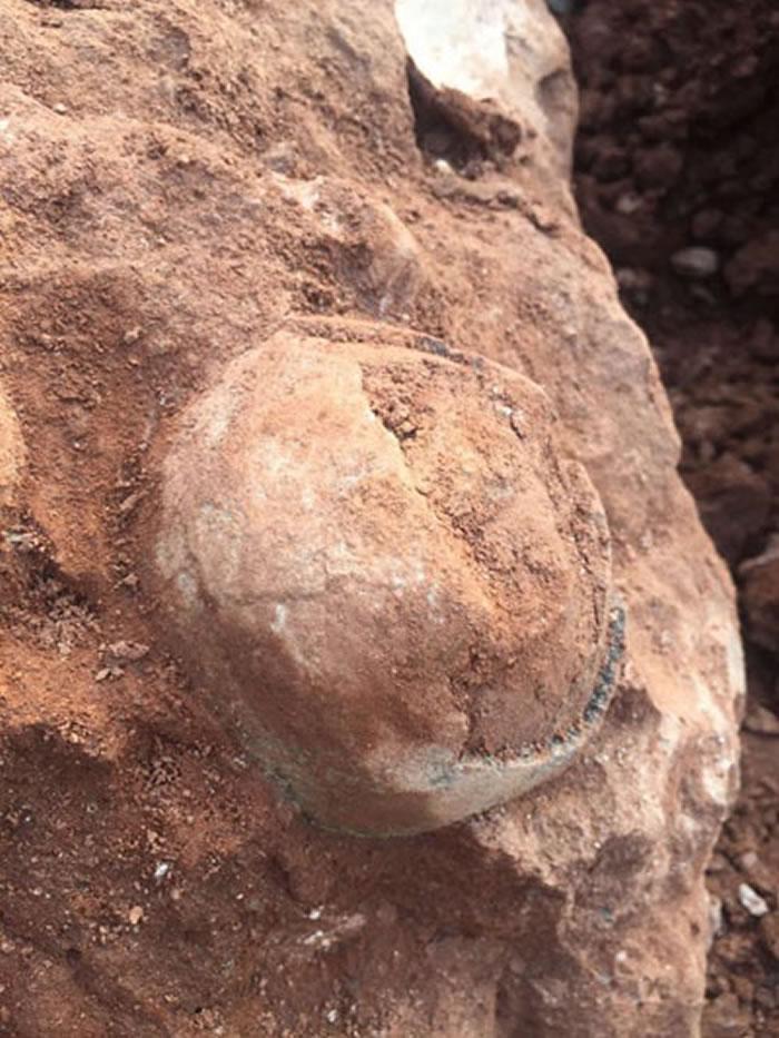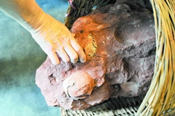 前天下午4时,广佛交界的黄岐北村涝区整治工程正在紧张作业中。眼尖的挖掘机师傅何师傅在翻斗挖出的一块红色大石头中,突然发现红色的沙质泥土上有青灰色石片镶嵌,远远看起来有点像“蛋”。