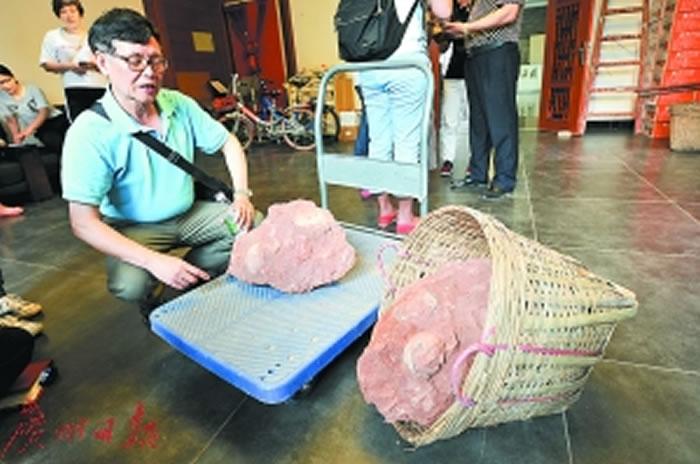 当天,被挖出来的一块疑似恐龙蛋化石的大石头被送往附近的广东书法园。根据文物科提供的文图资料,有专家初步鉴定,这块“大红石头”或许就是恐龙蛋化石,不过尚待进一步确认。