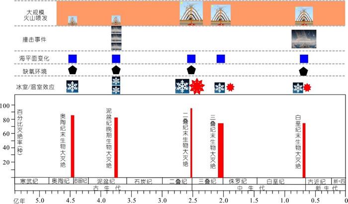 地质历史中五次生物大灭绝与火山喷发、撞击事件和全球性环境变化的对应关系。