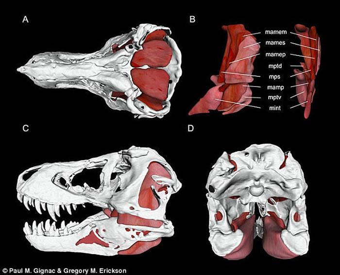 古生物学家分析了霸王龙现存“近亲”鳄鱼和鸟类等生物,并结合电脑模型还原霸王龙下颌肌肉,推测霸王龙闭合嘴巴能产生3630公斤咬力,是所有恐龙之最。