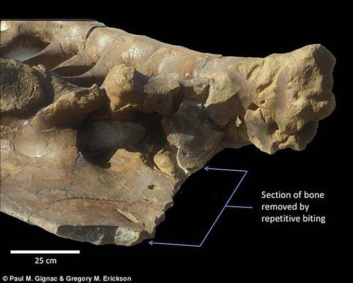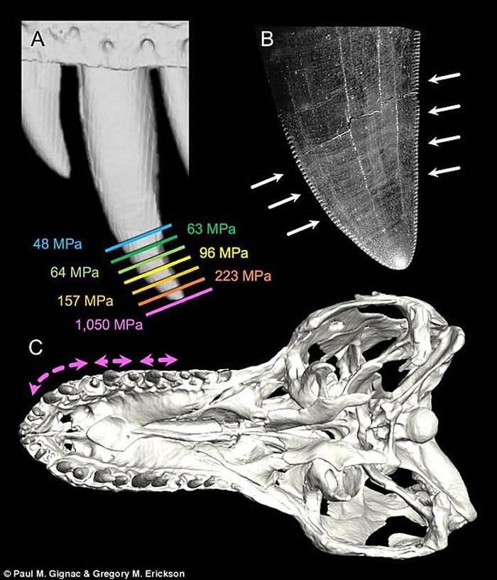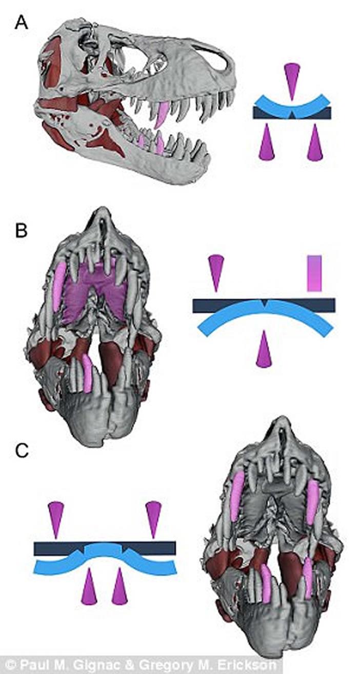 这种巨大咬力传导到霸王龙圆锥形、18厘米长的牙齿能产生每平方厘米3.03万公斤的强大压力,令霸王龙能够咬穿几乎任何血肉骨骼。