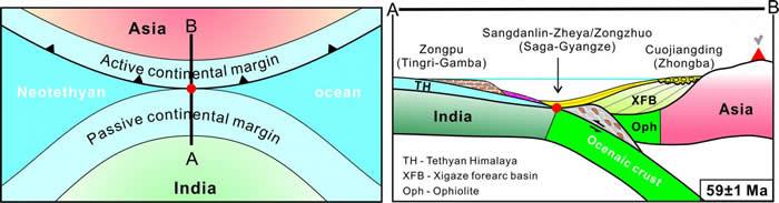 左图显示初始碰撞时间的定义示意图,指两大陆之间的洋壳消失、下伏大陆边缘远端抵达上覆活动大陆海沟的时间。右图基于西藏南部沉积记录重建的印度-亚洲大陆碰撞初始时期陆壳横剖面图