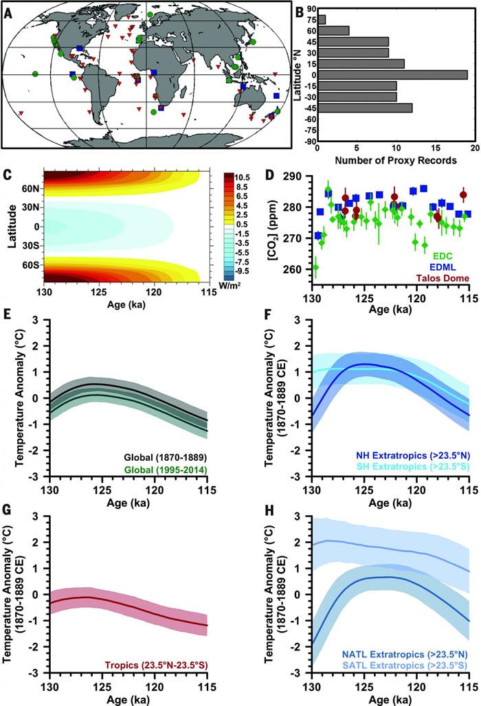 Jeremy S. Hoffman在此编纂了104个已发病的有关LIG海平面温度(SST)的记录,它们源自83个海洋沉积物钻探处的岩芯。他们将每个钻探处的岩芯与1870-1889年和1995-2014年的数据集进行了比对。数据显示,在LIG于12万9000年前开始的时候,全球海洋SST已经与1870-1889年时的平均SST相似。然而,到12万5000年前,全球SST增加了0.5° ± 0.3°C,它与1995-2014年间的平均值无法区别。这些结果表明,用大多数全球气候模型模拟的LIG全球平均年度SSTs过低。此外,这些数据显示,在LIG开始时的北半球大西洋SST比南半球的低。