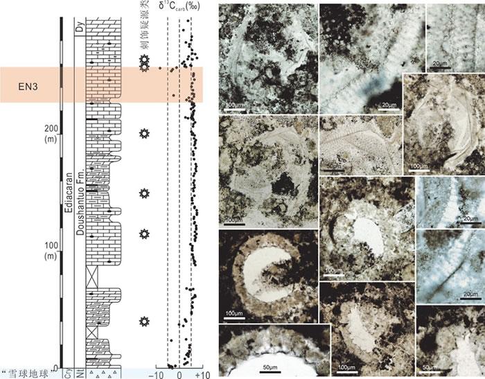 中国科学院南京地质古生物研究所早期生命研究团队长期开展华南陡山沱组微体化石的古生物学和生物地层学研究。近年来,南京古生物所博士研究生欧阳晴及其导师周传明研究员等在湖南张家界地区一条连续的斜坡相陡山沱组剖面中发现了大量的燧石结核。薄片观察显示燧石结核中保存了包括5属8种大型带刺疑源类在内的多种微体化石。这些化石的发现表明,大型带刺疑源类的生存空间可以延伸到局限盆地以外的广海海域。更有意义的是,两个大型带刺疑源类层位出现在该剖面的一次碳同位素负漂移之上。通过对比该剖面与邻近剖面的地层序列以及碳同位素变化特征,结果显示大型带刺疑源类的层位已经延续到EN3之上。如果这一推测成立,未来将有可能在更多剖面的EN3层位之上发现大型带刺疑源类化石,甚至在同一剖面发现大型带刺疑源类化石和埃迪卡拉型宏体化石的共存现象,从而改变我们对埃迪卡拉纪真核生物演化进程的认识。