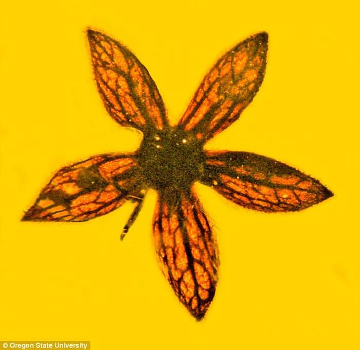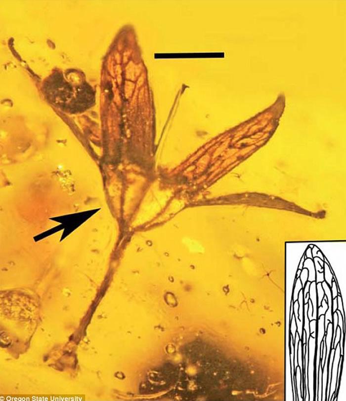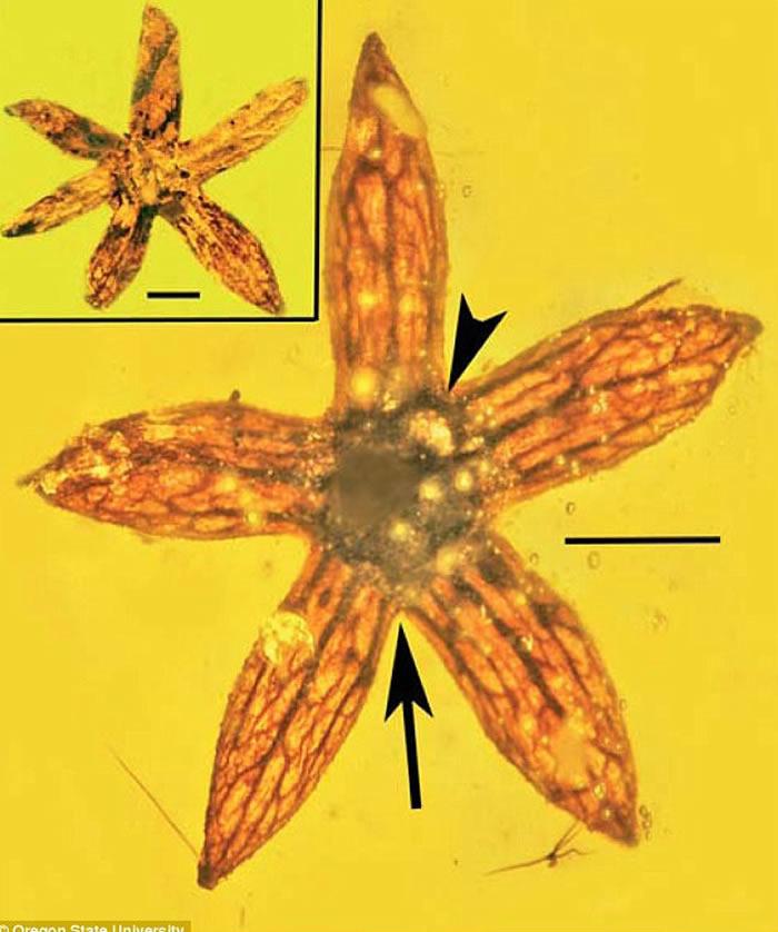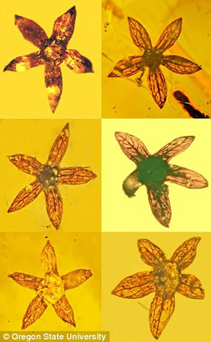 古生物学家研究缅甸琥珀时发现了7块保存着古代花朵完整花序的化石。它们非常小,每朵的直径不超过5毫米,与其他古花的构造不同,它们的雌蕊有一个不同寻常的分叉。
